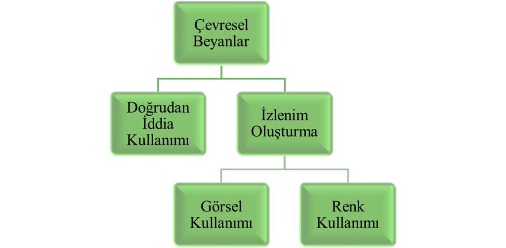 “Doğrudan iddia kullanımı” ürünün çevresel etkisine ilişkin sözlü ifadelerin kullanımı anlamına gelirken “izlenim oluşturma” olarak sınıflandırılan kategoride reklamlarda tercih edilen görsel materyaller ve renk seçimi aracılığıyla şirketin, ürünün veya hizmetin çevreye duyarlı olduğu yönünde bir algı yaratılması hususu üzerinde durulmaktadır. Dolayısıyla her ne kadar sözlü olarak ifade edilmese de reklamlarda çevre ile özdeşleşmiş yeşil rengin kullanımı veya doğa ile ilgili görsel kullanımı çevresel beyanların izlenim oluşturma olarak adlandırılan kategori altında sınıflandırılmasına olanak tanımaktadır (Koç, 2025: 55).