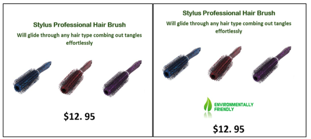 Reklamlarda iddiaların türü ve sunuluş biçimi, tüketici algısının oluşumunda belirleyici rol oynamaktadır. Görsel veya yazılı unsurlar aracılığıyla yaratılan çevresel çağrışımlar, ürünün gerçek özelliklerinden bağımsız olarak tüketicinin algısını yönlendirebilmektedir. Nitekim, Polonsky ve başk. tarafından 2024 yılında yapılan bir araştırmada, çeşitli ürün kategorilerinde ürünün gerçek özelliklerini yansıtan ancak çevresel beyan içermeyen ürün görseli ile birlikte “çevre dostu” veya “çevreyi önemsiyoruz” gibi gerçeği yansıtmayan iddia kullanımı yöntemiyle tüketicilerin tercihleri sınanmıştır. Şekil-4’te yer alan iki görsel ile yapılan bu deneyde sağdaki ürün hakkında gerçeği yansıtmasa da “çevre dostu” iddiasına maruz kalan katılımcıların, ürüne ilişkin daha olumlu çevresel algılara sahip olduğu anlaşılmıştır.
