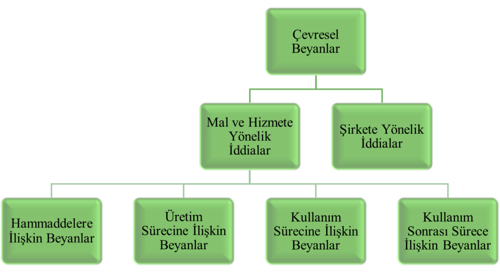 Bu ayrıma göre çevresel beyanlar bir mal veya hizmete yönelik olabileceği gibi şirketlerin imajlarını güçlendirmeye yönelik aktivitelerine ilişkin de olabilmektedir. Ürünlere yönelik iddialar; hammaddelerine, üretim sürecine, kullanım sürecine ve kullanım sonrası sürece yönelen iddialar olmak üzere dörde ayrılmıştır (Koç, 2025: 57).