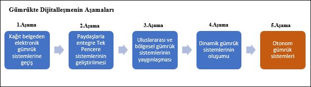 Kağıt ortamında yürütülen gümrük işlemlerinin elektronik ortama alınarak bir gümrük sistemi üzerinden yürütülmesi dijitalleşmedeki ilk aşama olarak kabul edilirse, geliştirilen gümrük sistemlerinin tek pencere sistemleri gibi diğer kamu kurumları ve özel sektör paydaşlarıyla entegre hale getirilmesini ikinci aşama, ulusal ve bölgesel gümrük sistemlerinin yaygınlaşmasını da üçüncü aşama olarak kabul edebiliriz.