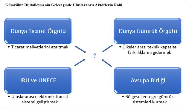 Bu kapsamda, Dünya Ticaret Örgütü’nün ticaret maliyetlerinin azaltılması amacı, Dünya Gümrük Örgütü’nün üye ülkeler arasındaki teknik farklılıkların giderilmesi amacı, IRU ve UNECE’nin özellikle TIR ve e-TIR kapsamındaki faaliyetleri ile Avrupa Birliği’nin entegre elektronik gümrük sistemleri oluşturma amacı çerçevesinde gümrükte dijitalleşmenin geleceğinin nasıl şekillenebileceği detaylı bir şekilde incelenmiştir.